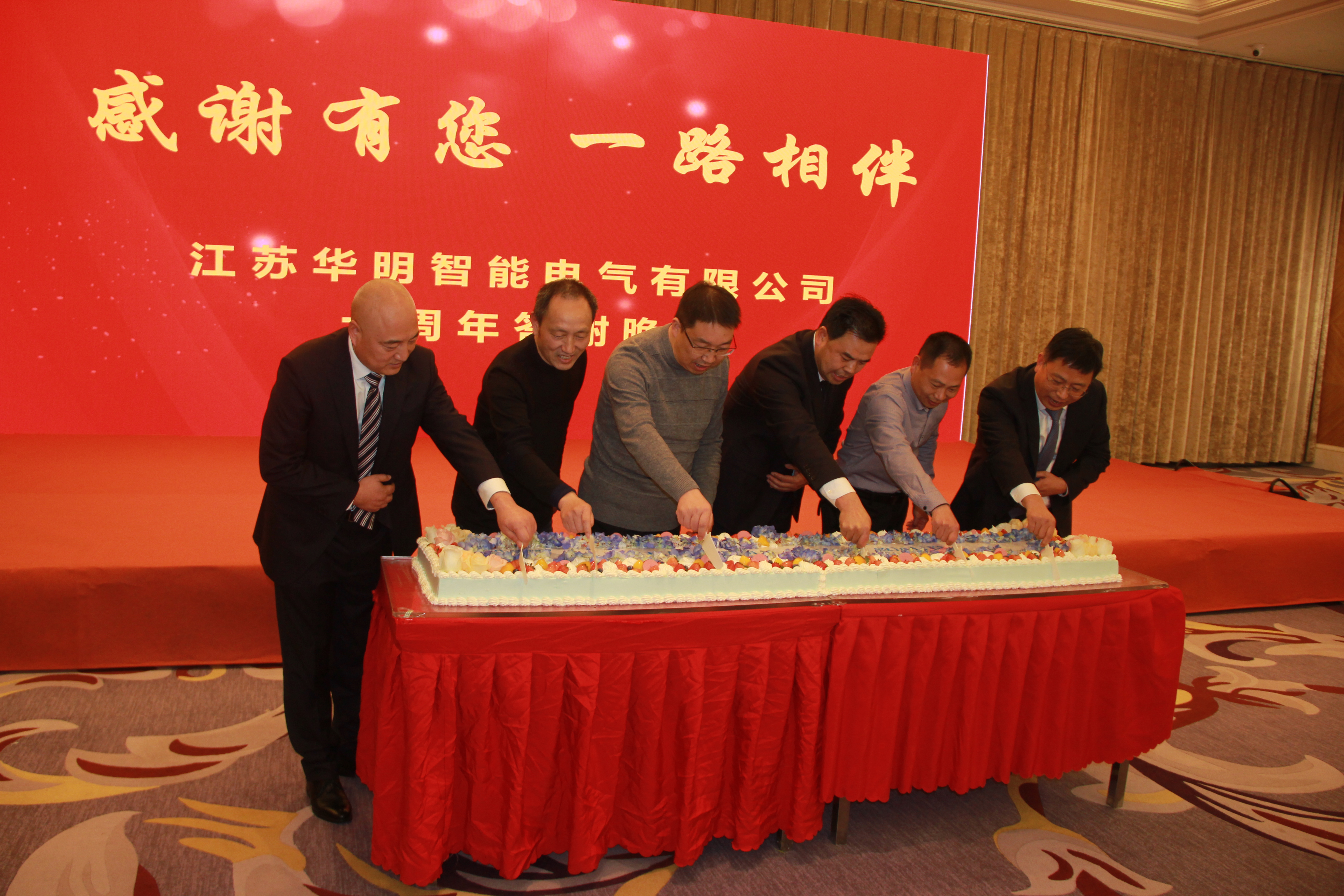 当天晚上,,,,,,,以“十年扎根、建基筑梦、初心不改、致远行稳”为主题的江苏华明智能电气有限公司十周年庆典答谢晚宴在宿迁市恒力酒店二楼多功能厅隆重举行。。。。。